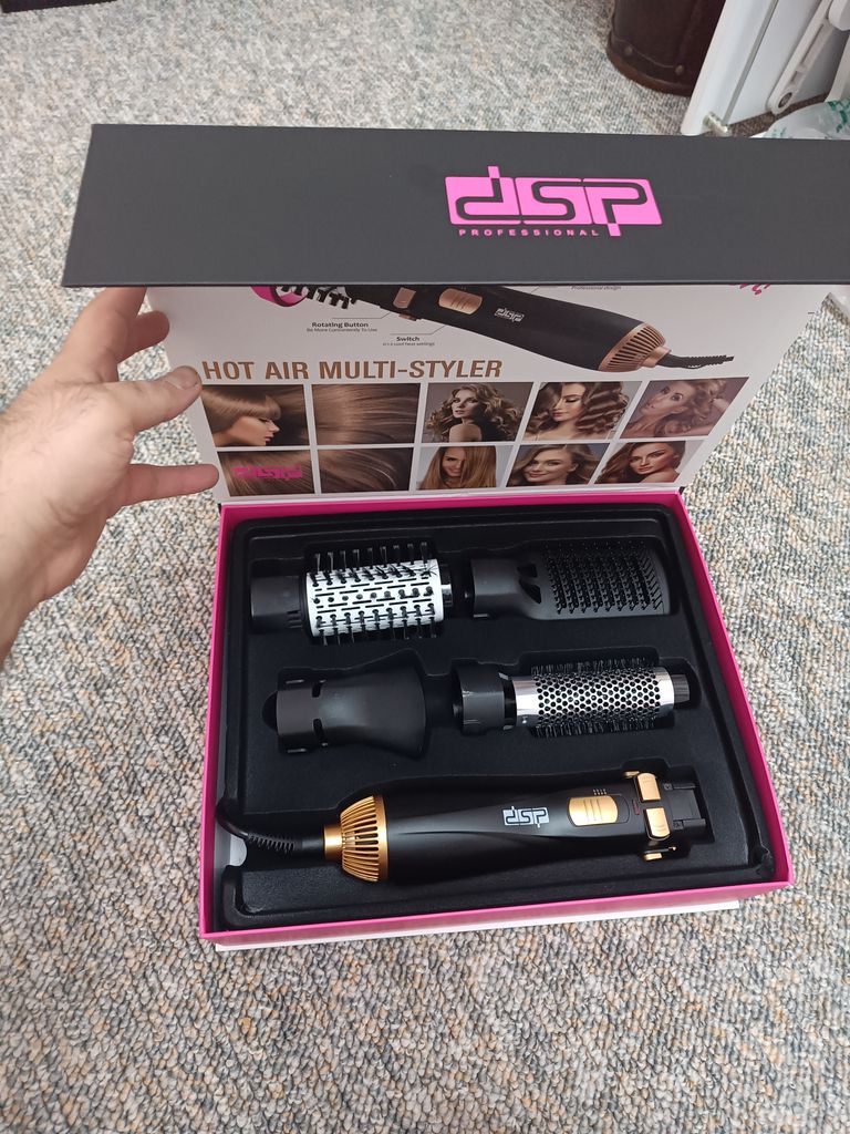 مشکل بسیاری از خانم ها در حین سشوار کشیدن موهای خود ، نگه داشتن همزمان برس و سشوار در دست است که معمولا برای این کار نیازمند کمک می باشند ، به همین خاطر این محصول از کمپانی خوش نام dsp می تواند این مشکل را حل نماید. سشوار چرخشی dsp مدل E_50001 با دارا بودن چهار سری مختلف قابل تعویض کمک می کند تا موهای شما صاف و یا حالت دار گردند. امتیاز بعدی داشتن سری چرخشی در 2 سایز مختلف می باشد که با توجه به حجم مو ، می توان سایز مورد نظرتون را انتخاب کرده و به راحتی و حتی با یک دست موهای خود را حالت دار و یا صاف کنید و در میهمانی بدرخشید.از ویژگی های دیگر این محصول هم می توان به سیم چرخشی 360 درجه ، امکان چرخش برس در 2 جهت مختلف ، طراحی ارگونومیک و تنظیم دما اشاره کرد.ویژگی بعدی، پکیجینگ کادویی این محصول می باشد که علاوه بر استفاده شخصی ، می تواند انتخابی مناسب برای هدیه به عزیزانتون هم باشد.سشوار های چرخشی نسل جدید از سشوارها هستند ، که علاوه بر قابلیت تولید باد گرم میتوانند با استفاده از برس های که قابلیت تعویض و چرخش دارند و در یک جهت به دلخواه کاربر حرکت میکنند ، علاوه بر خشک نمودن مو به آن حالت دهند . در صورتیکه بتوانید قابلیت های این دستگاه را بشناسید میتوانند مانند یک آرایشگر حرفه ای در مدت بسیار کوتاهی موهای خود را حجم دهی ، خوش حالت ، فر یا صاف نمایید.سشوار چرخشی دی اس پی با طراحی و ترکیب رنگ بی نظیری که دارد یک محصول فوق العاده زیبا و خوش دست است و میتوانید بهترین و خوش سلیقه ترین سشوار برای هر خانه وسالن باشد.