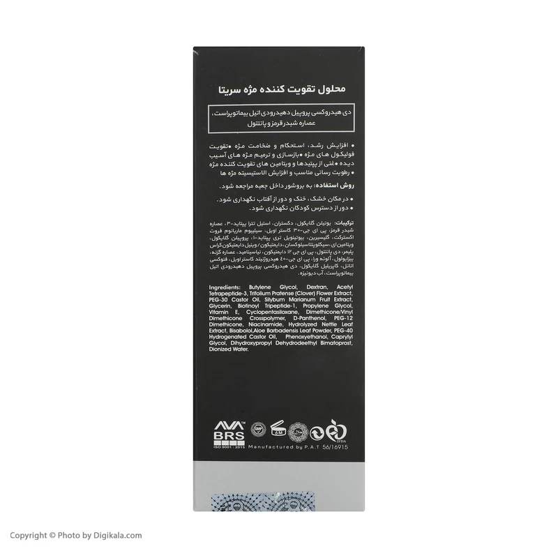 سریتا مدل Eyelash Lotion با حجم ۷ میلیلیتر در یک محفظه کوچک و مشکی رنگ عرضه میشود و دارای یک برس مخصوص است. این محلول، ترکیبات مؤثری دارد که به افزایش رشد و ضخامت مژهها کمک میکند. استفاده منظم از این محصول میتواند باعث طولانیتر شدن فاز رشد مژه و کاهش زمان ریزش طبیعی آن شود. بههمیندلیل، این محصول برای افرادی که دچار ریزش مژه هستند یا میخواهند مژههای پرتر و بلندتری داشته باشند، بسیار مناسب است.